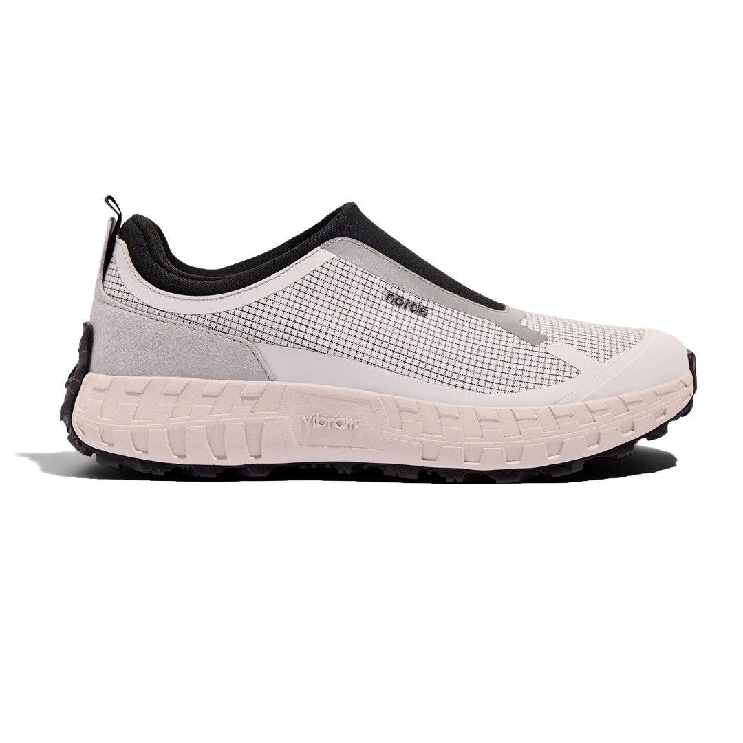 This laceless approach shoe utilizing a customized Vibram® midsole and soleplate as its foundation allows for long days on feet with uncompromising traction. A Bio-Dyneema® upper with an added elasticized Bio-Dyneema® allows for a fit that remains unchanged over time. Between a padded heel collar and reversed heel tab is a pull tab through which the shoes can easily be clipped to a pack.